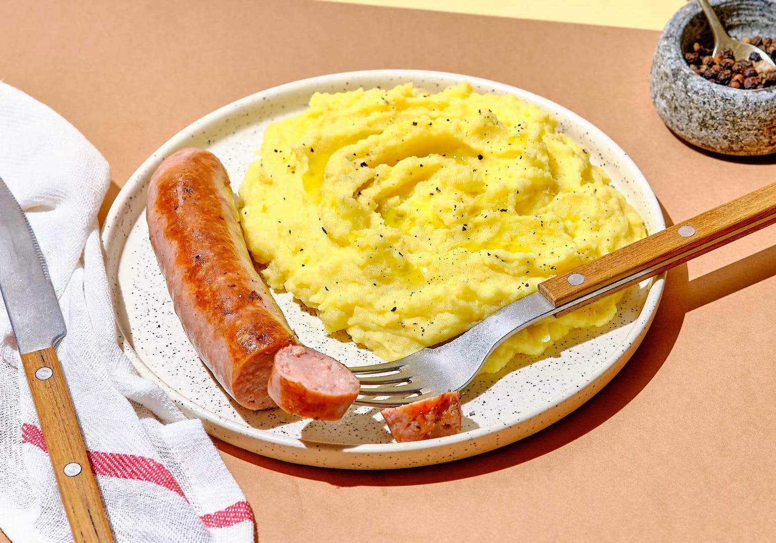 Aligot (Eau, tome fraîche salée (LAIT), LAIT , flocon de pomme de terre, CRÈME (LAIT), protéines de LAIT, ail, poivre, sel.),Saucisse de Toulouse (Viande de Porc, Sel, Poivre)