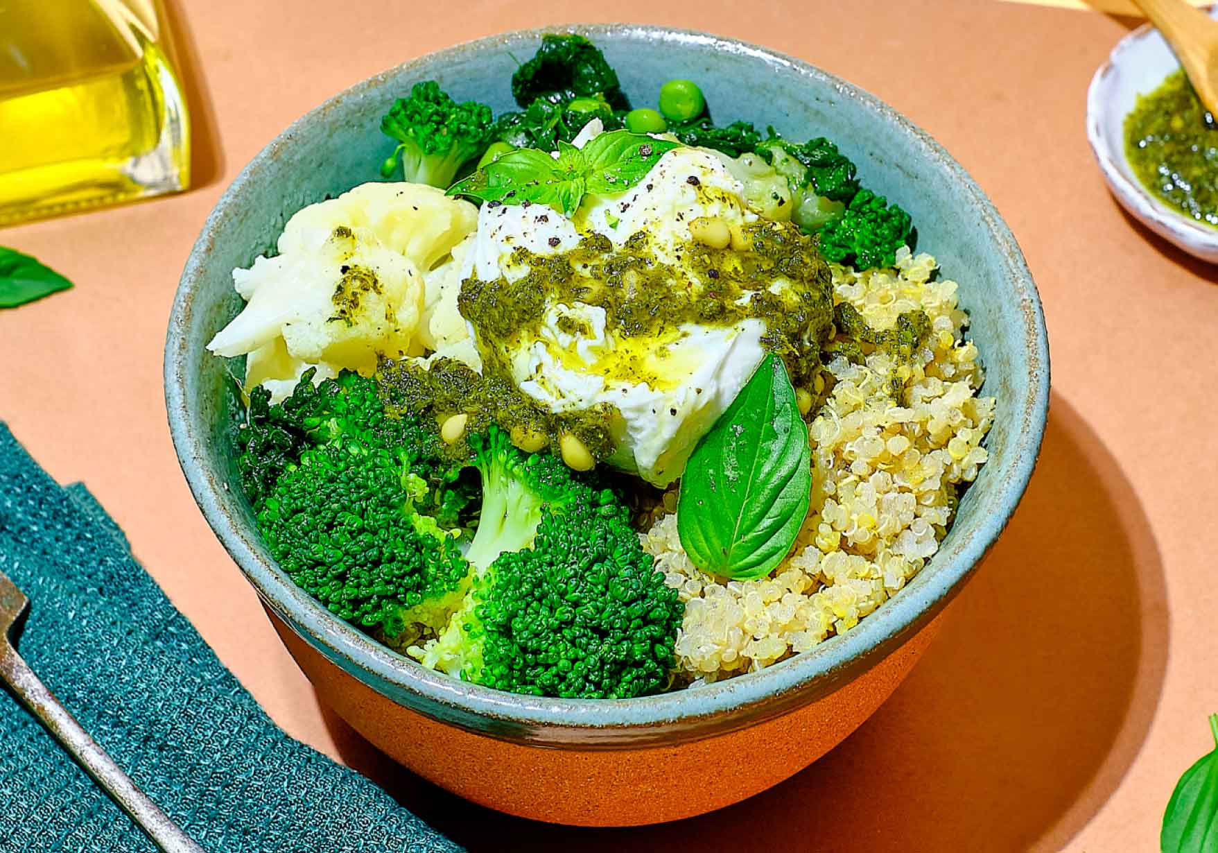 Trio de quinoa à l'huile d'olive vierge extra (eau, trio de quinoa 34% (graines de quinoa blanc, graines de quinoa rouge, graines de quinoa noir), huile d'olive vierge extra 3,8%, sel),Légumes verts au pesto et aux graines (Haricots verts, brocolis, petits pois, haricots gourmands, pesto (Basilic Genois DOP (28%), huile d'olive vierge extra (25%), huile de tournesol, noix de cajou (FRUIT A COQUE), lactosérum en poudre (LAIT), préparation à base de fromage (fromage (LAIT), lactosérum (LAIT), émulsifiant : phosphate de sodium), sel, ail, fibre végétale (bambou)), Grana Padano (LAIT, sel, présure, lysozyme d'OEUF), pignons de pin, régulateur d'acidité : acide citrique), huile de tournesol, graines (graines de tournesol, graines de courges, cranberries, baie de Goji)),Burrata (Mozzarella (LAIT pasteurisé, sel, présure), CREME U.H.T)
