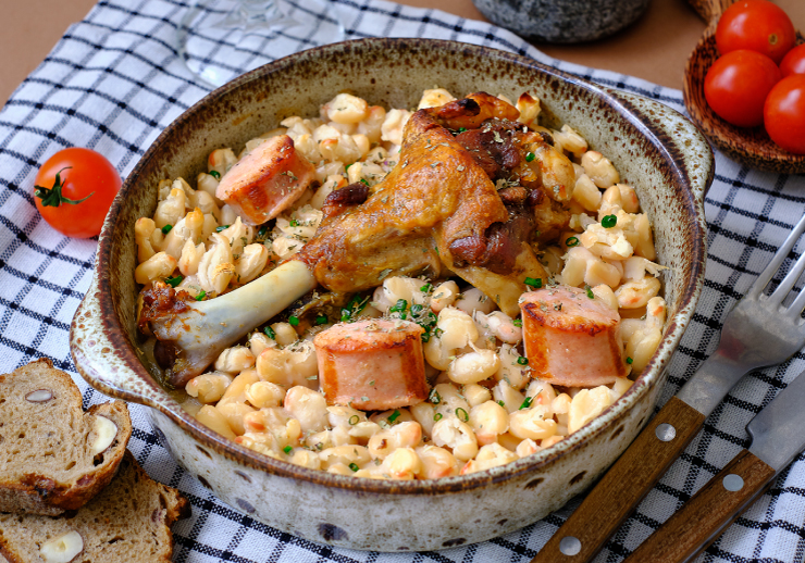 Cassoulet (Haricots Blancs, Oignons, Ail frais, Huile d'olive, Thym frais, Sel, Poivre),Manchon de Canard et Saucisse Fumee Knack (Manchons de canard origine France, Saucisse Knack, Graisse de canard, Sel),Chapelure (Farine de BLE (GLUTEN), Sucre, Sel, Levure)