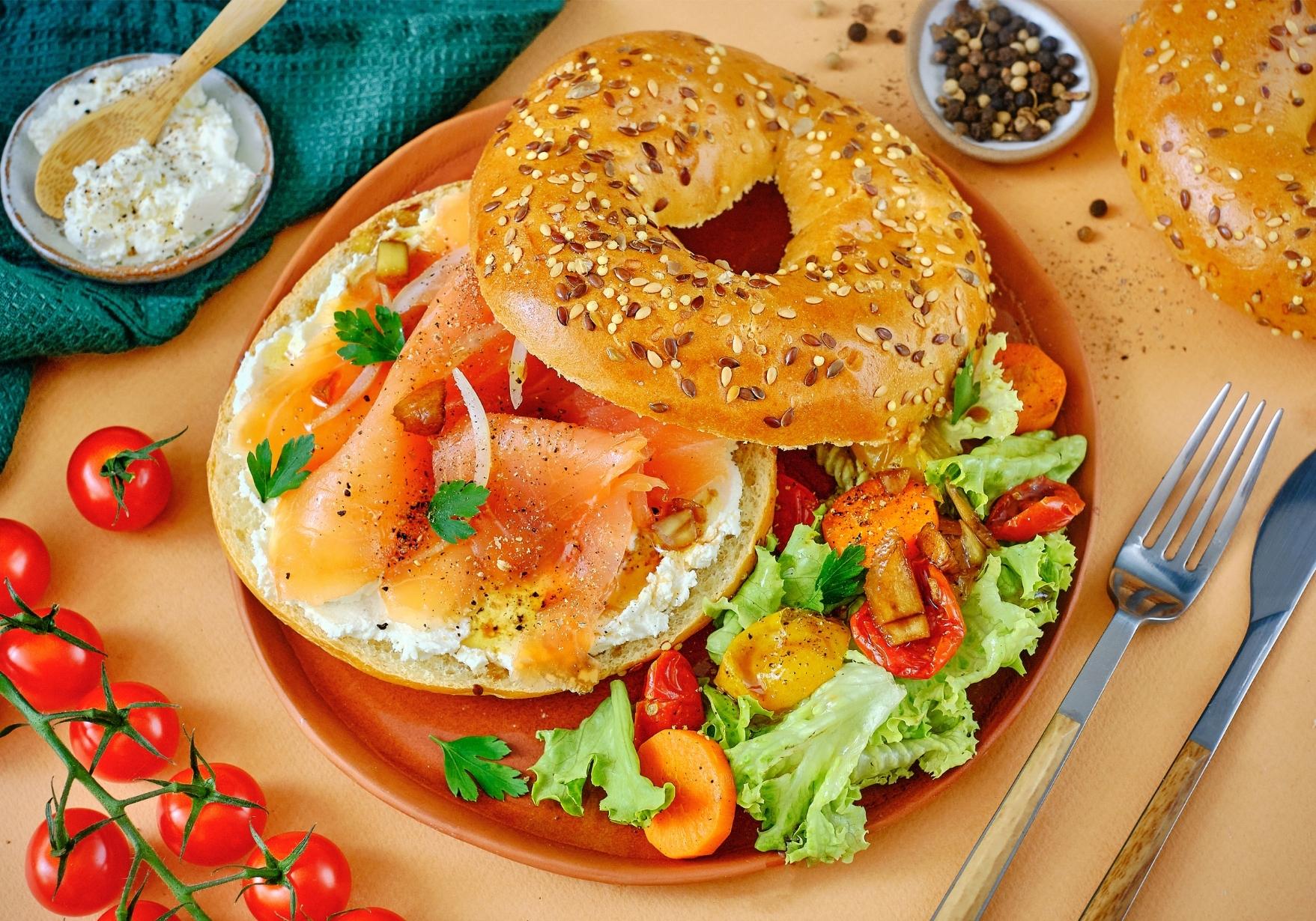 Bagel (Farine de BLÉ (GLUTEN), sucre, poudre au BEURRE (beurre 90 %, maltodextrine, LAIT, émulsifiant (E471), OEUFS, GLUTEN de BLÉ, sel fin, poudre de crème (LAIT), épaississant (gomme de guar, émulsifiant (E472), farine de BLÉ malté (GLUTEN), Levure désactivée, bêta-carotène, antioxydant (acide ascorbique), arôme, hémicellulases (BLÉ), alpha amylases fongiques (BLÉ), levure fraîche, graines de SESAME ),Mâche (Mâche),Vinaigrette au Citron Bio (Huile d'olive vierge, Jus de citron),Philadelphia (Lait entier, Crème, Protéines de lait, Sel),Saumon Fumé Ecossais (Saumon atlantique (élevé en Ecosse ou Norvège), sel)