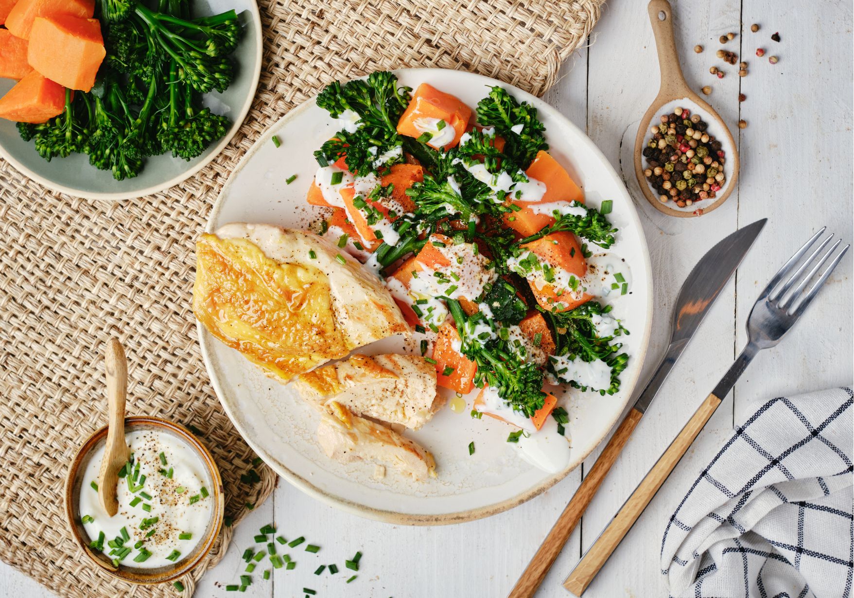 Poulet au thym cuisiné à 62,5°C (poulet jaune halal (origine France), huile d'olive vierge extra, huile de tournesol, thym, sel),Sauce yaourt à la menthe et au cumin (Yaourt grec (LAIT de vache, CREME, protéines de LAIT, ferments lactiques), jus de citron, menthe, cumin, sel ),Patate douce cuisinée au zathar (Patate douce 96%, huile d'olive vierge extra 3%, zathar 0,8% (origan, SESAME complet, sumac), sel),Bouquets de brocolis cuisinés à 85°C (brocolis 98%, huile d'olive vierge extra 0,8%, sel)