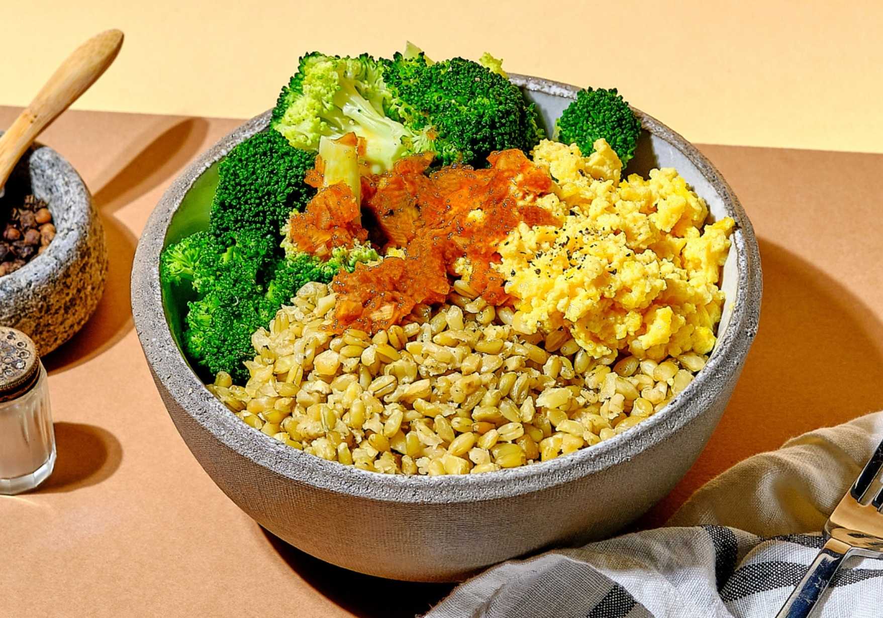 Petit épeautre (Petit épeautre (GLUTEN), eau, huile d'olive, sel),Bouquets de brocolis cuisinés à 85°C (brocolis 98%, huile d'olive vierge extra 0,8%, sel),Oeufs Brouilles (ŒUFS entiers (origine : France ou UE) 35.9%, CREME (LAIT), stabilisant : carraghénane, jaune d’ŒUF 21%, huile de tournesol, sel, épaississant : gomme xanthane, poivre, curcuma),Sauce saté (huile d’olive, huile de colza, échalotes, vinaigre de cidre (contient des SULFITES), saté (piment, ail, sucre, huile de tournesol, épices (MOUTARDE, réglisse), cacahuètes (ARACHIDES), graines de SESAME, échalotes, sel), sauce SOJA (eau, SOJA, BLE, sel, alcool), purée d’ail, sel, poivre blanc moulu)