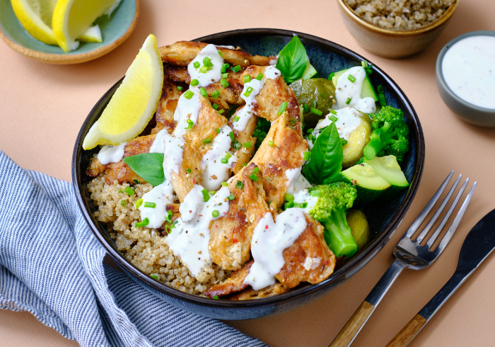 Trio de quinoa à l'huile d'olive vierge extra (eau, trio de quinoa 34% (graines de quinoa blanc, graines de quinoa rouge, graines de quinoa noir), huile d'olive vierge extra 3,8%, sel),Aiguillettes vegan et légumes verts à l'ail des ours (aiguillettes vegan (eau, concentré de protéine de SOJA, huile de tournesol, arôme naturel, sel, épices, fibre végétale, tomate en poudre, herbes), brocolis, haricots verts, petits pois, ail des ours, huile d'olive vierge extra, sel),Sauce yaourt grec ciboulette tahini (yaourt grec (LAIT de vache pasteurisé, crème de LAIT, ferments lactiques), tahini (SESAME), jus de citron, ciboulette, sel)